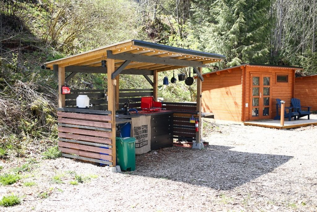 Guests have access to shared facilities, including an outdoor kitchen and bathhouse bunkie, which features a private hot water shower and composting toilet.