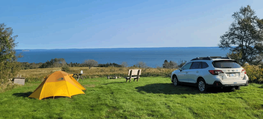 The first campsite, situated across the road from the bay, accommodates tents and RVs up to 45 feet long. The site provides views of the water and rolling hills and allows visitors to walk easily to the beach or nearby attractions such as Cape d’Or.
