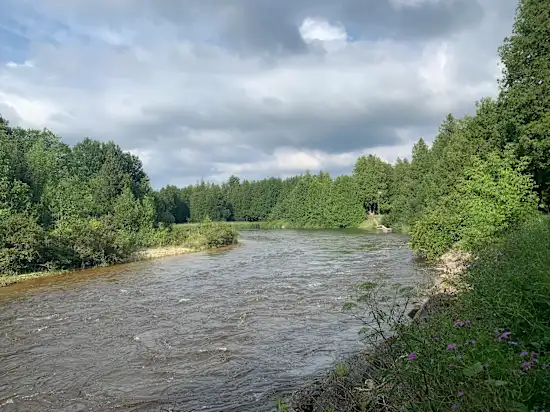 The 137-acre property, located along the Saugeen River, offers tent and trailer sites surrounded by farmland and natural scenery, about 10 minutes from nearby amenities and an hour’s drive from beaches and waterfalls, including Sauble Beach, Hoggs Falls, and Inglis Falls.