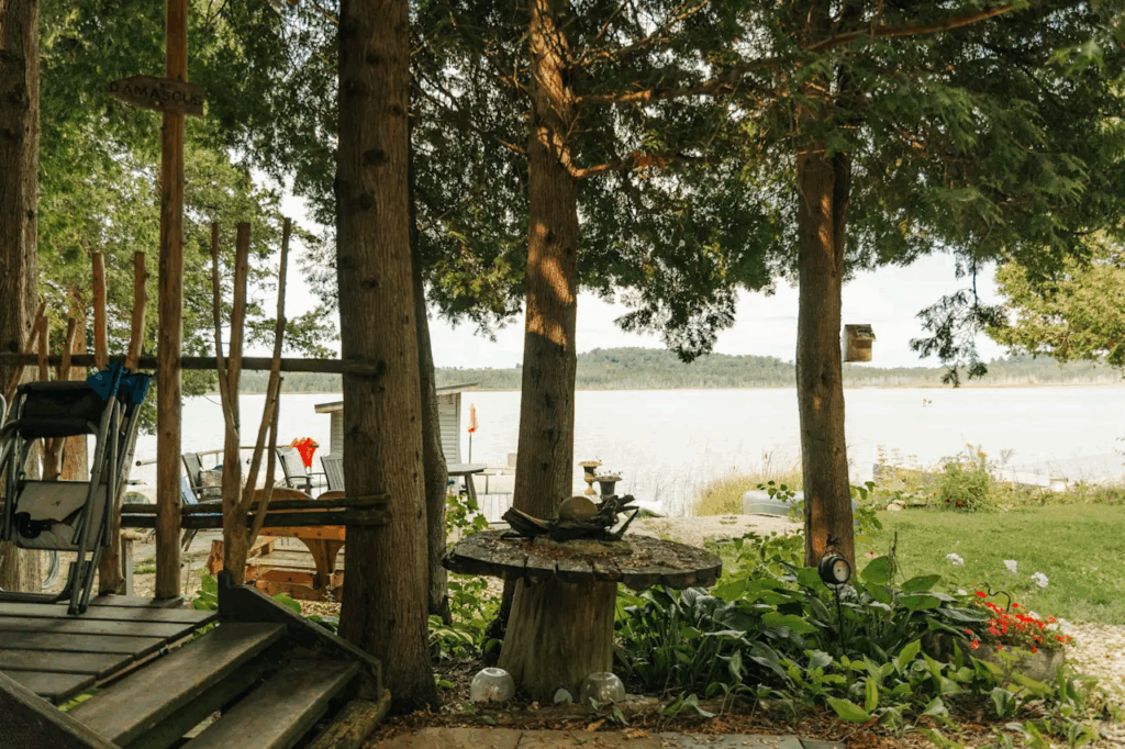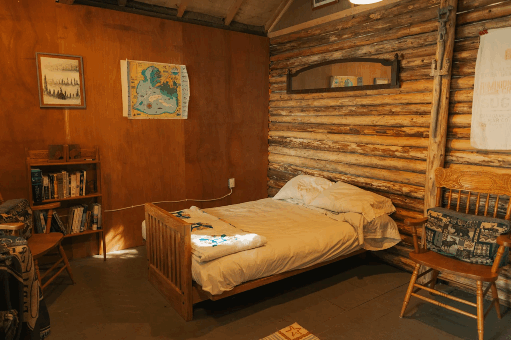 Grey Havens includes two primary lodging options. The Lakefront Log Cabin, a 16-by-16 log structure, accommodates up to three guests and has received upgrades since 2024, including seasonal heating and loft access.