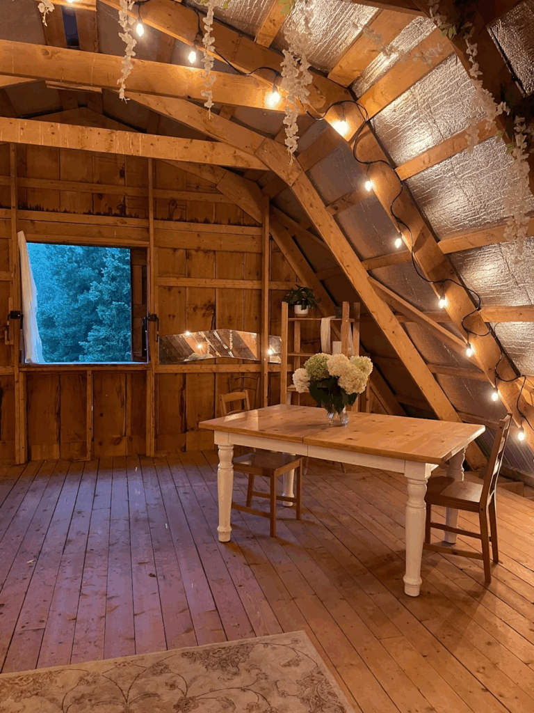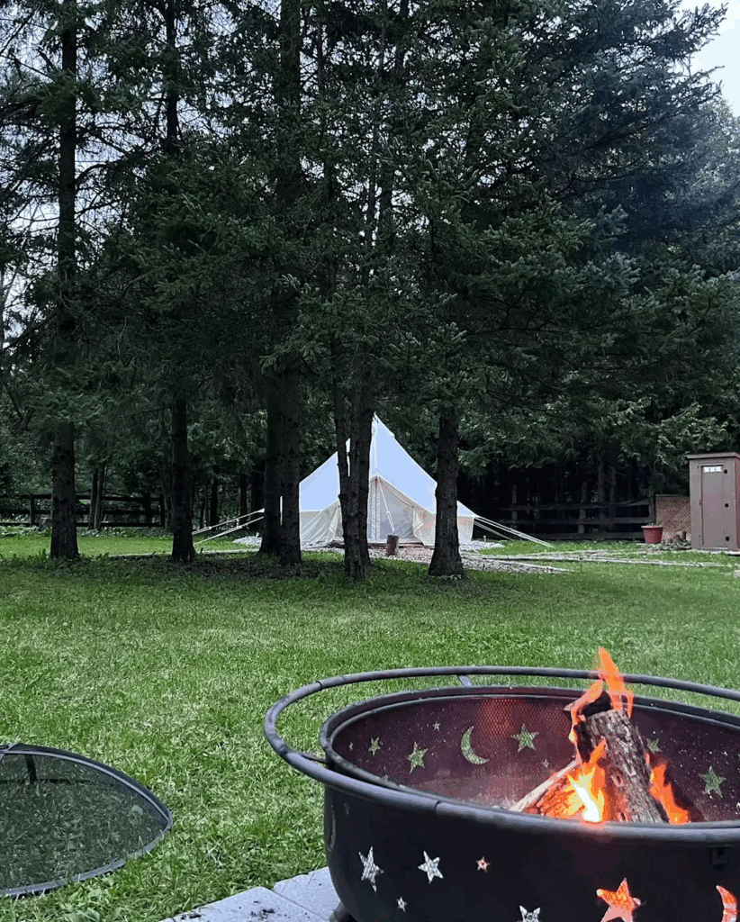 The glamping setup includes a queen bed, an outdoor mini kitchen with a barbecue, and a dining area. While there are no showers or Wi-Fi, guests have access to a private outdoor toilet and the barn’s loft for relaxation. Campfires are permitted, and firewood bundles are available for purchase.