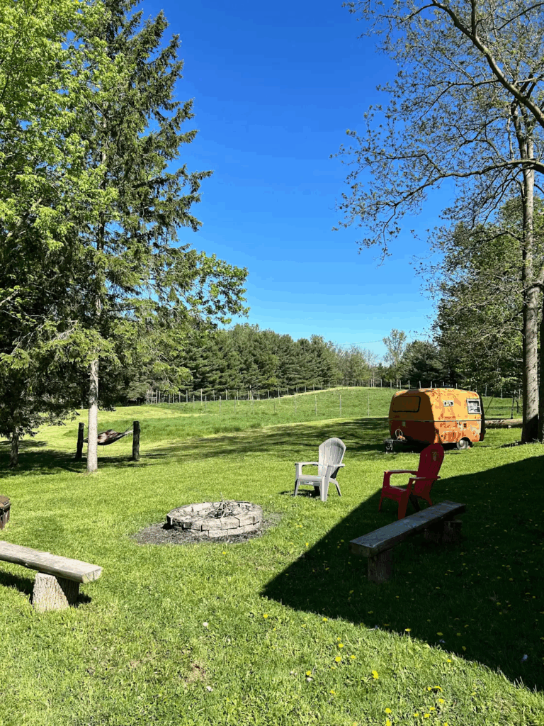 Two accommodation options add variety to the camping experience. “Krista’s Vintage Boler,” a 1970s-era trailer, offers guests a nostalgic stay with electricity, sleeping space for two to three people, and proximity to a forest walking trail.