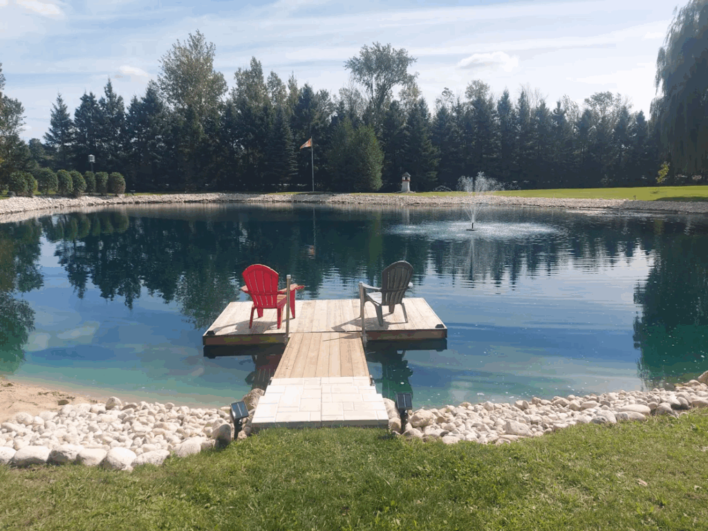 The property includes a landscaped pond area known as Sevene Pond, complete with river rock, a water fountain, a small dock, and a sandy beach area. Guests may also rent two kayaks and one canoe for use on the water.