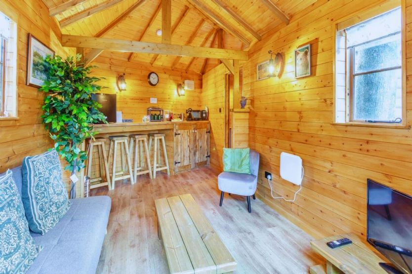 The cabin accommodates two guests and includes a kitchenette with a mini-fridge, microwave, kettle, and toaster. A separate sitting area features a sofa and a television with views over the gardens and lake.