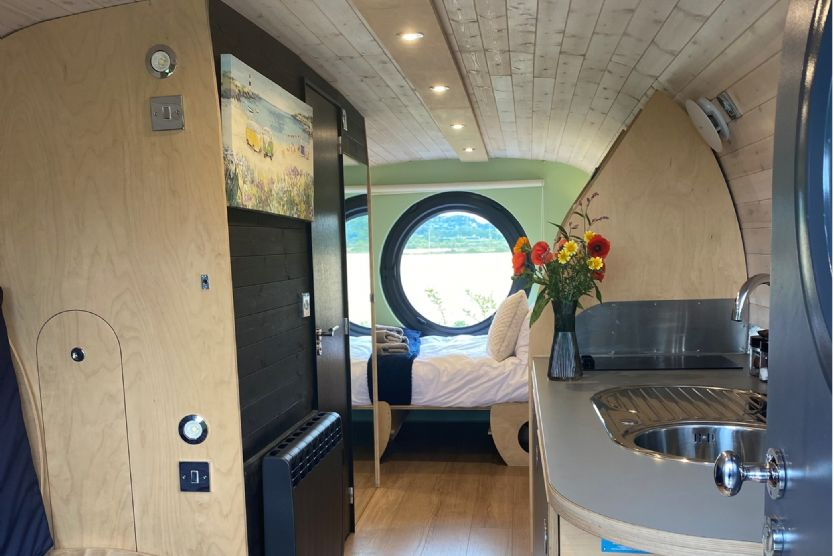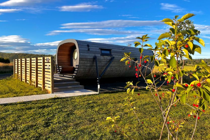 The Ben Cleuch Anthropod includes a private deck with a hot tub, kitchen facilities, and a full-size double bed. The self-contained unit also features a private shower and flushing toilet, Smart TV, Bluetooth sound system, and WiFi.