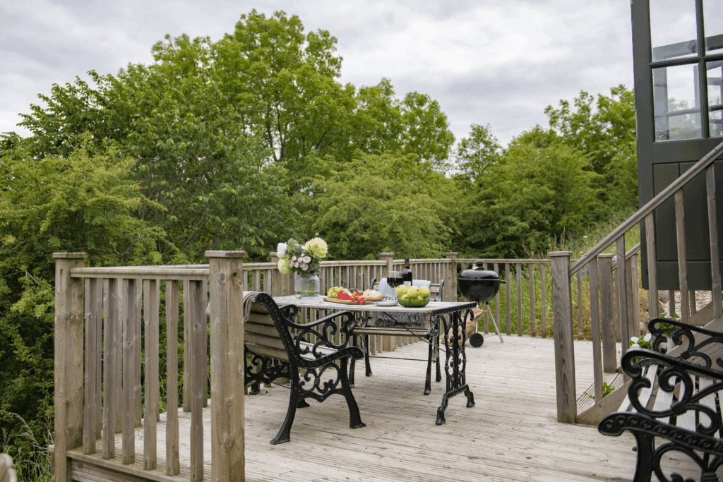 The retreat encourages outdoor dining and leisure activities such as stargazing, relaxing by the fire pit, and exploring the surrounding woodland.