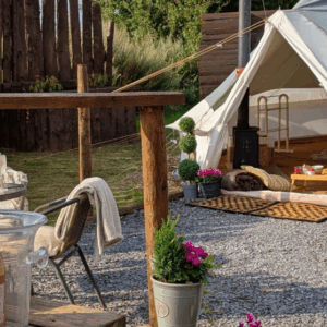 The tent is equipped with electric lighting, plug sockets, a mini fridge, and cookware essentials, while a private shower room nearby features double wash basins, a shower, and a WC. Towels, linens, and basic household supplies are provided for guests’ convenience.