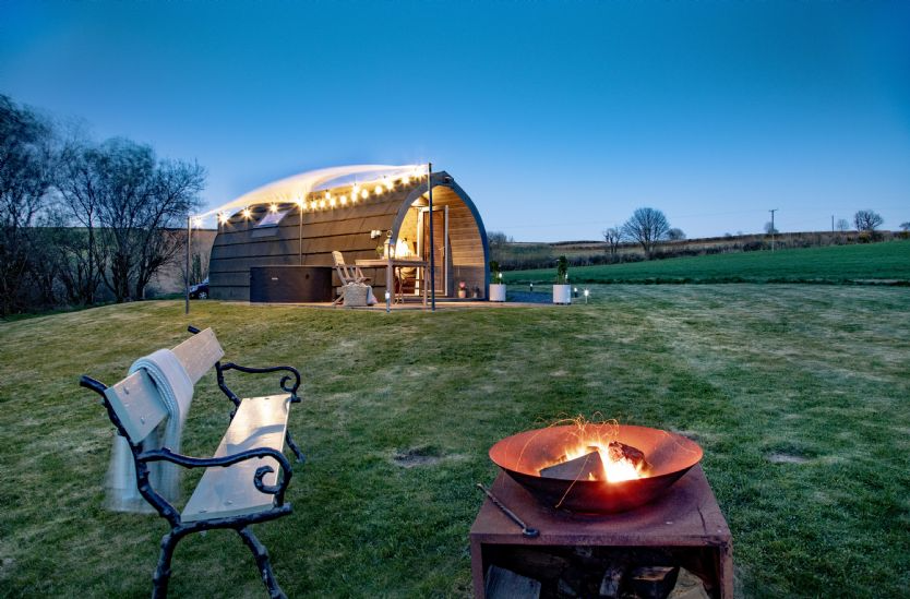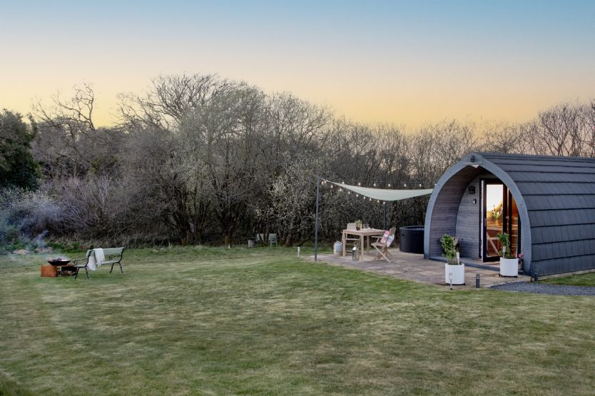 The pod is positioned within private grounds surrounded by farmland and woodland, giving guests access to outdoor seating areas, a firepit, and an electric hot tub. Operators say the unit is designed as a small-scale retreat within reach of key regional attractions, including the Eden Project and several coastal destinations.