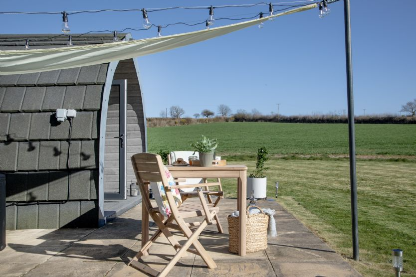 The bedroom area contains a double bed, and the property provides towels, bed linen, basic toiletries, and logs for the firepit, with additional logs available for purchase on site. Outdoor features include solar-powered lighting, a garden bench, a seating area, and on-site parking directly behind the pod.