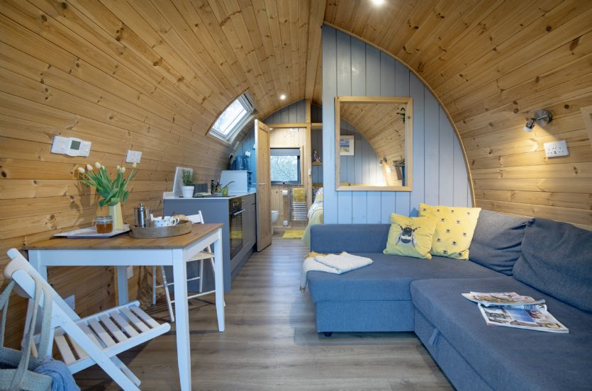 The accommodation includes a fully equipped kitchen with an oven and combination grill, microwave, induction hob, and fridge-freezer. The living area features a sofa, dining table, electric heating, underfloor heating, and a television. The pod also offers a private bathroom with a walk-in shower and a flushing toilet.