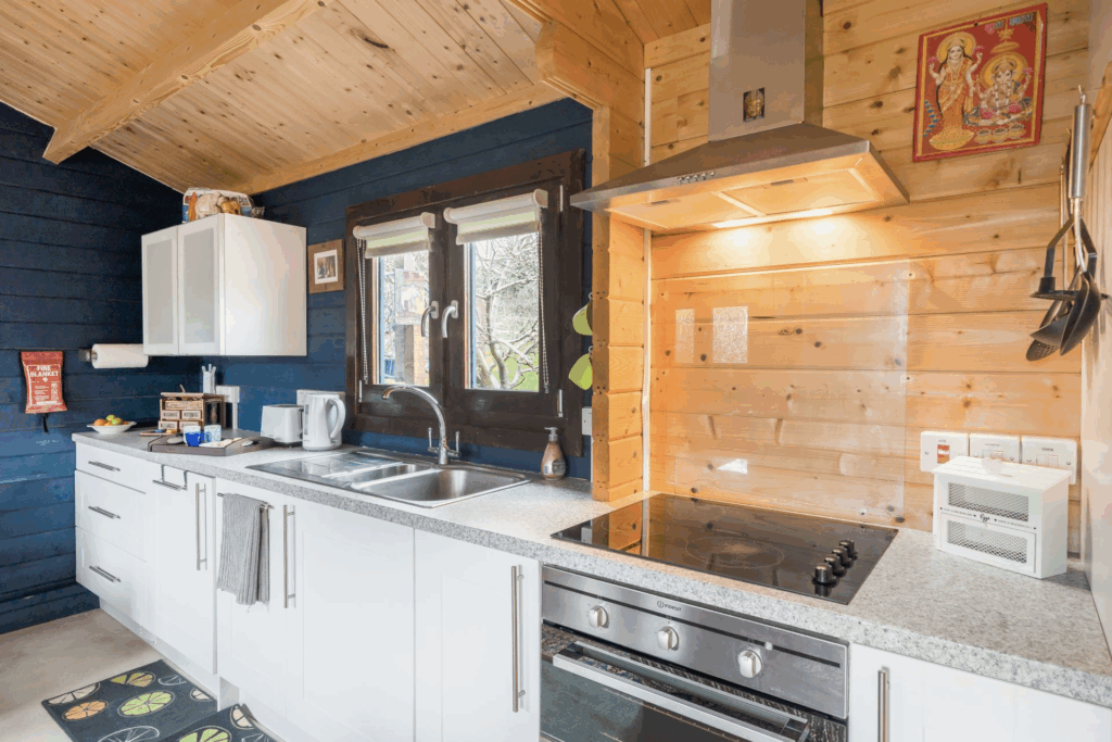 The cabin also features electric heating, a sitting area with a sofa and television, and a dining table. Accommodation includes a bedroom with a 5′ king-size bed and an en-suite shower room. Double doors from the bedroom open to a private terrace and garden.