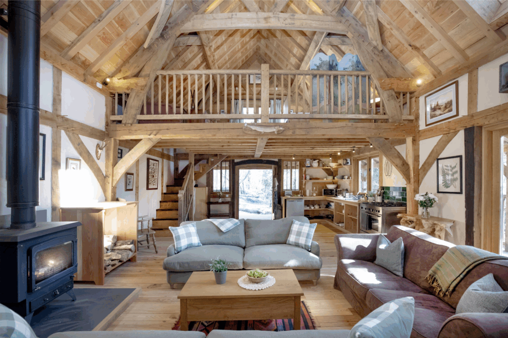 The handcrafted lodge features an open-plan interior centered around a large wood-burning stove, with comfortable seating and a dining area designed for relaxed meals or quiet evenings.
