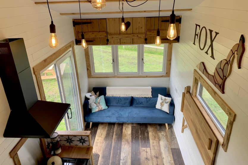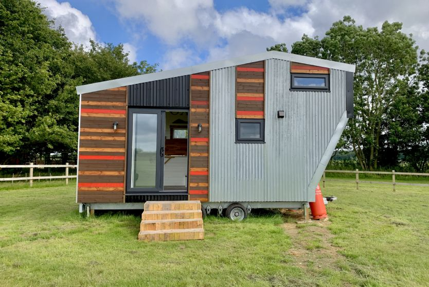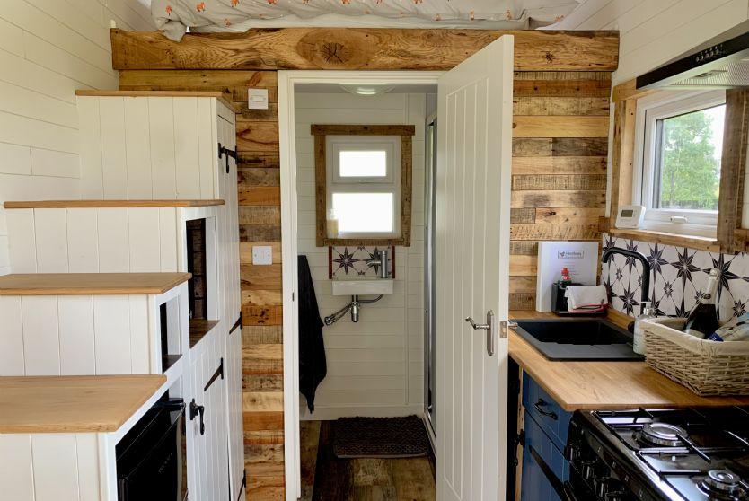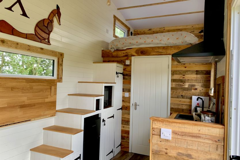 The tiny house is a bespoke, fully insulated and double-glazed structure designed to offer self-contained accommodation. Internally, it features an open-plan living space on the ground level that includes a kitchen equipped with an oven, grill, four-ring gas hob, microwave, and fridge freezer, along with crockery and cooking utensils.