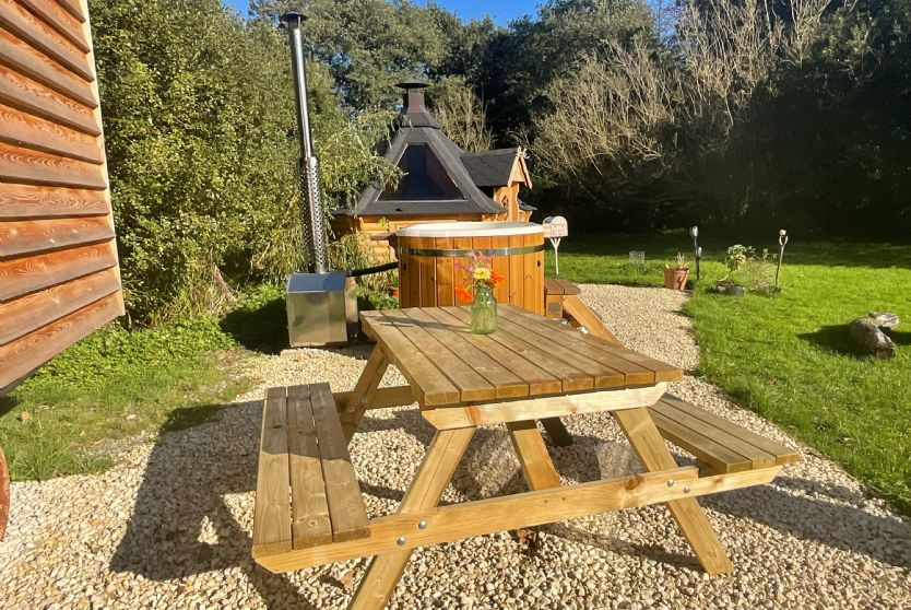 Guests have access to an adjoining outdoor area that includes a hammock, hanging chair, picnic bench and a fire pit. A wood-fired hot tub is available for an additional charge, and staff can prepare it before arrival upon request.