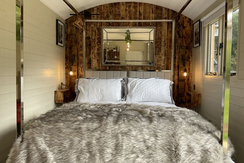 The accommodation includes a king-size four-poster bed with storage, Egyptian cotton bedding, a kitchenette with a double gas hob and under-counter refrigerator, and a shower room supplied with towels and toiletries.