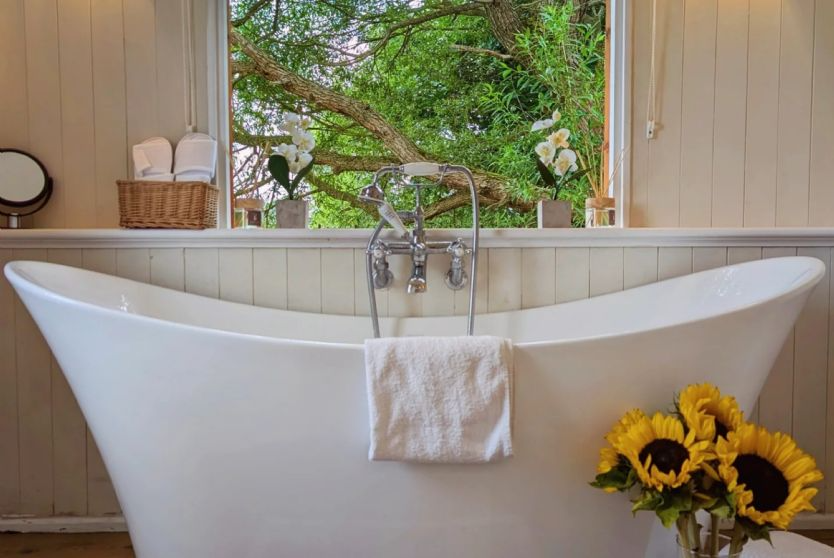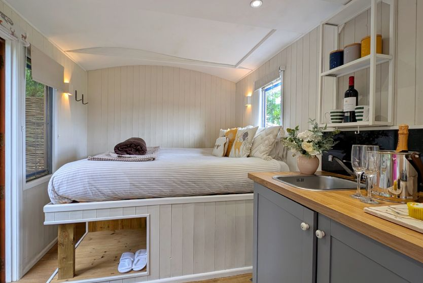 Designed for couples seeking a quiet retreat, the accommodation includes an open-plan interior with a super-king-size bed, kitchenette, and private bathroom. The bathroom features a free-standing bath with a hand-held shower, wash basin, and heated towel rail.
