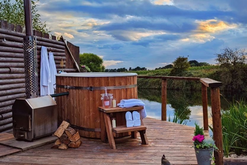 Outside, visitors can enjoy a Scandinavian-style wood-fired hot tub overlooking the water, a barbecue area, and garden seating for outdoor dining or relaxation.