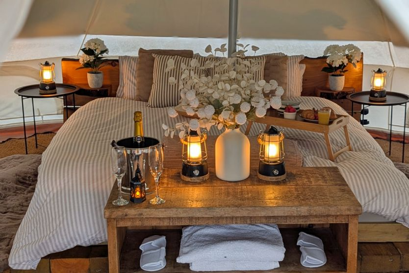 Guests stay in a spacious bell tent furnished with a super-king-size bed, wood-burning stove, sofa, dining area, and gas camping stove. Solar-powered lighting is used throughout, in keeping with the site’s low-impact approach.
