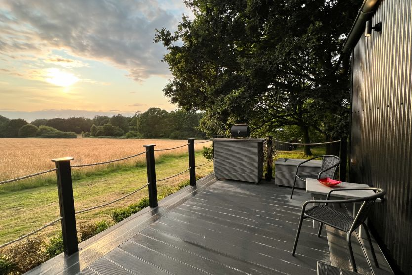 A king-size bed and recliner chairs add to the sense of comfort, while the private deck with picnic furniture and a barbecue area extends the living space into the surrounding countryside. Guests are provided with bed linens, towels, and essentials for an independent stay.