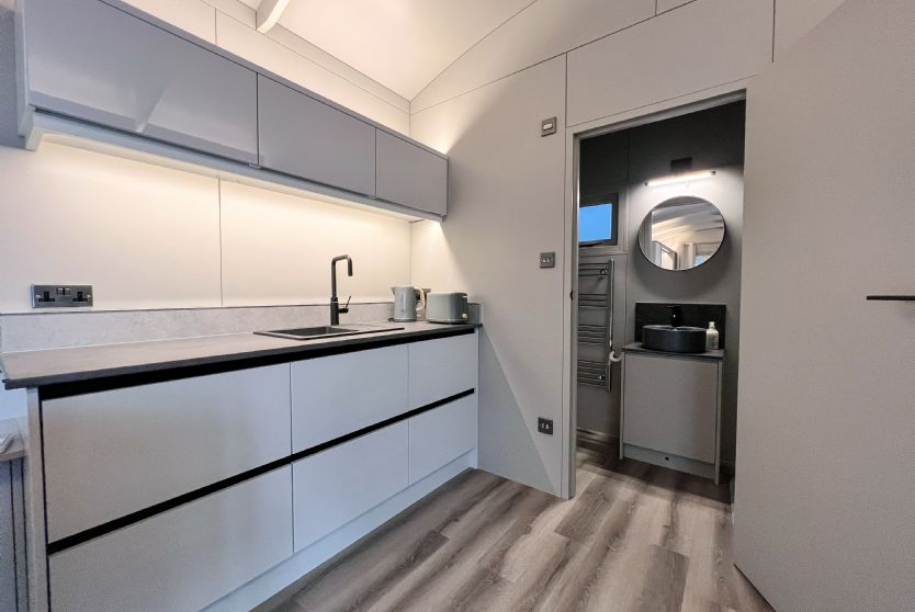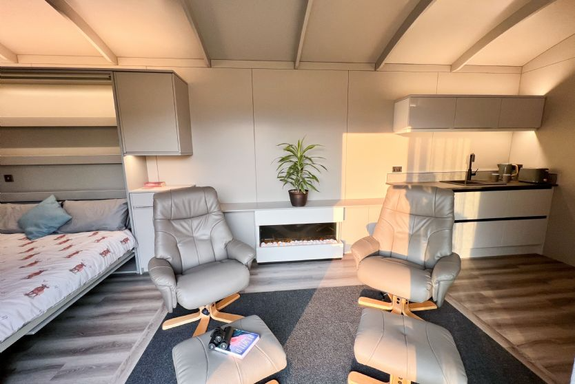 The accommodation departs from the traditional shepherd’s hut style with a contemporary, open-plan interior. Molly includes a fully equipped kitchenette with modern appliances, an en-suite shower room, and a spacious living area featuring underfloor heating and a living flame fire.