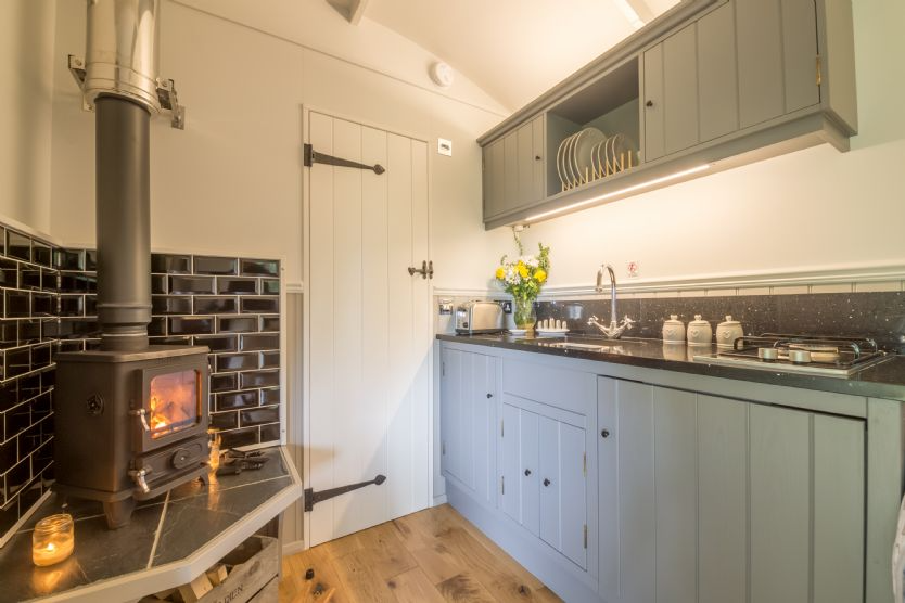The hut includes a king-size bed, indoor shower room, private WC, wood-burning stove, electric lighting, plug sockets, television, and a fully equipped kitchen incorporating a gas hob, microwave, oven, fridge, and combination microwave. Logs, towels, bed linen, and complimentary toiletries are provided.