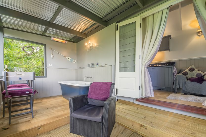 Outdoor features include an enclosed garden, garden furniture, gas fire pit, veranda with a double-ended freestanding bath, and a private wood-fired hot tub. Parking is provided in a shared gravel area to the rear of the accommodation.