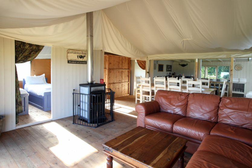 The tents include a private shower room, flushing toilet, and a fully equipped kitchen with an induction hob, running water, and basic cookware. Heating and ambiance are provided by a wood-burning stove, with battery-powered and candle lighting ensuring a low-impact environment.