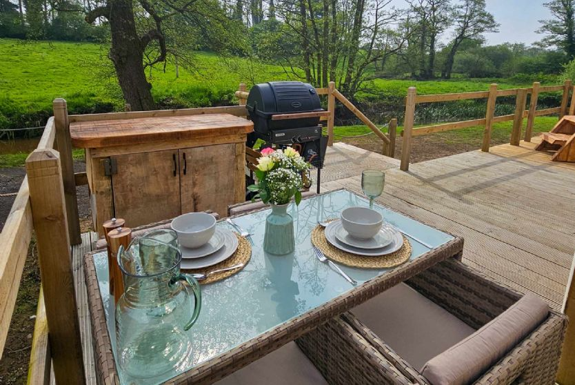 The private bathroom cabin includes a shower, flushing toilet, and butler sink, while outdoor amenities such as a rattan dining area, gas barbecue, and wood-fired hot tub enhance the stay experience.