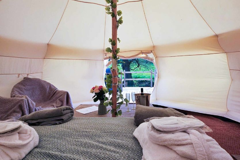 Built on raised decking beside the river, the bell tent features a king-size bed with provided linens and towels, a log burner for warmth, and battery-powered lighting.