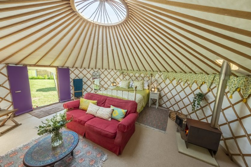 The eighteen-foot Mongolian-style yurt includes a king-size brass-ended bed, a three-seater sofa, and a trundle bed that converts into two single beds for families or small groups.