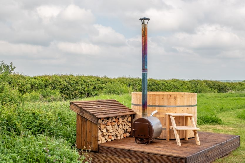 A wood-fired hot tub set on an elevated platform provides a scenic view of the valley, available for an additional fee of £75 for the first night and £35 for subsequent nights. The property is open all year and welcomes children over two years old, though dogs are not permitted.