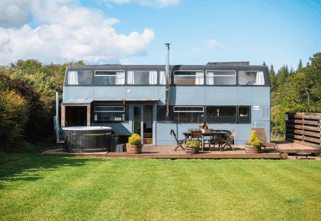The business, operated by Sandy, his wife Sioned, and his parents Balfour and Elaine, has grown gradually over the years. Each glamping unit is converted from a salvaged bus and is equipped with self-catering facilities, a wood-fired hot tub, and a sauna.