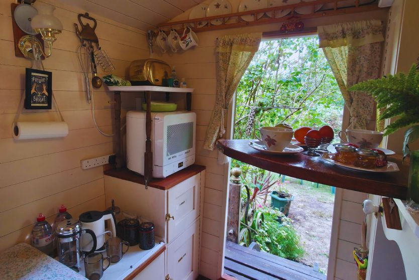 The accommodation features a double bed with bed linen, a fold-down kitchen area, a microwave, a kettle, a toaster, electric lighting, and heating.