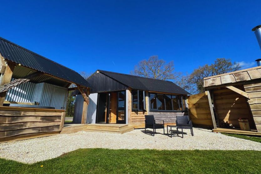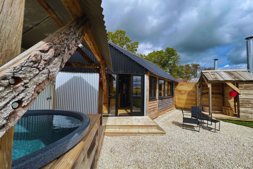 Outdoor amenities include a fire pit and barbecue area, garden furniture, and a boiler-heated hot tub located on an external deck. Logs for the fire pit are supplied at no additional charge. Parking is available on site, and the cabin accommodates up to three dogs for a small additional fee. Site guidelines request that guests observe quiet hours after 11 p.m., reflecting the property’s positioning as a family-oriented site.
