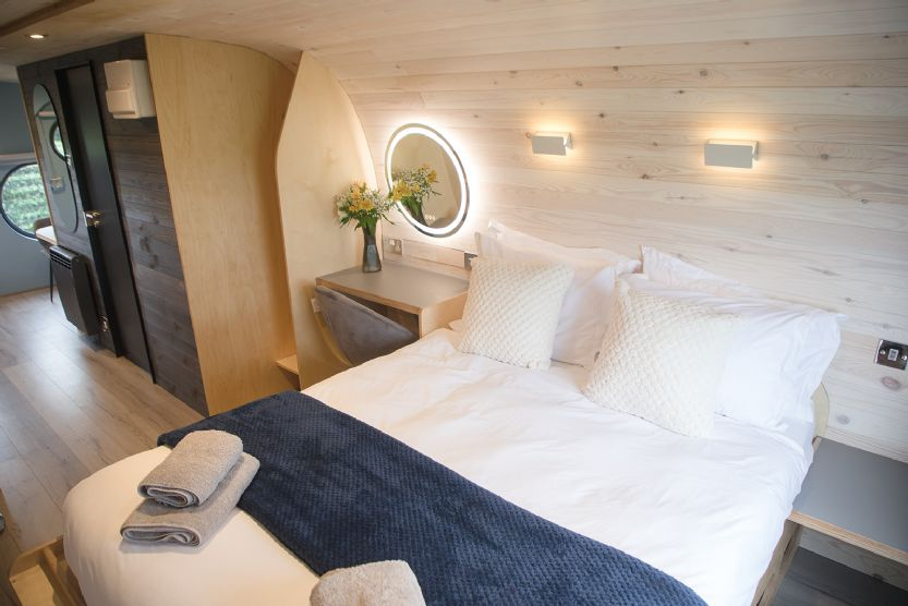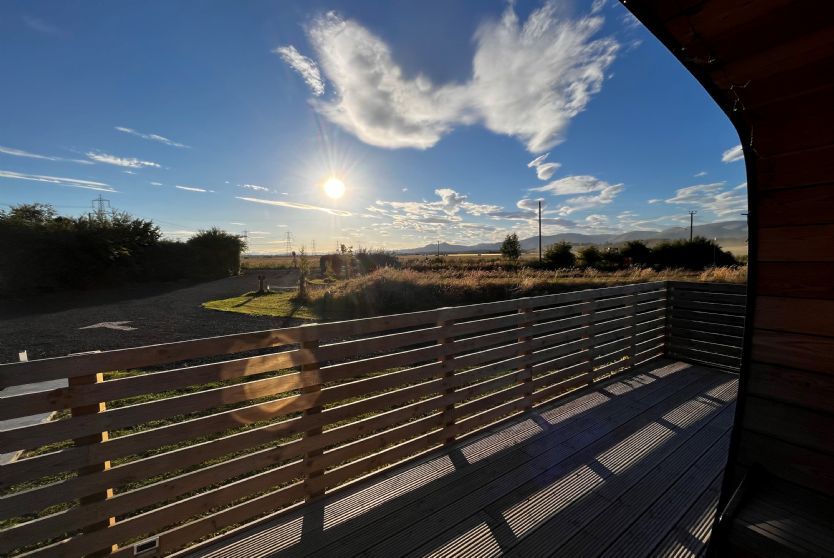 The accommodation includes a self-contained pod with a full-size double bed, private shower room, flushing toilet, kitchenette, and an outdoor deck with a private hot tub.