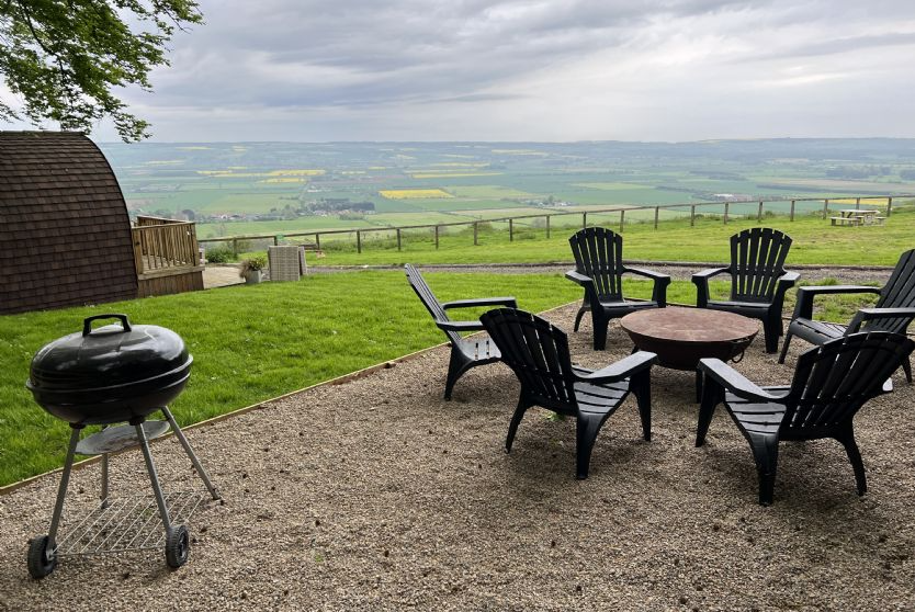 Located on a ridge with views across the Vale of Pickering and toward the North Yorkshire Moors, the pod forms part of a three-unit setup alongside Pheasant Roost and The Vale View. The site received a Visit England Gold Award in April 2021.