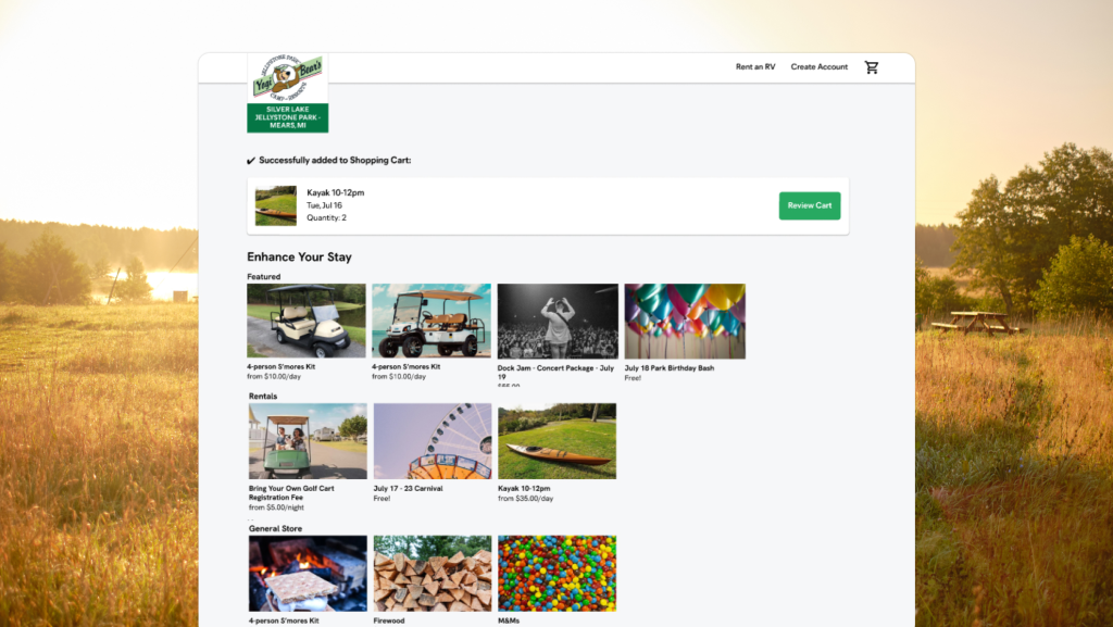With Day-use Add-ons, campground operators can create and sell add-ons tied to specific days; manage daily capacity, pricing, and scheduling in one platform; reduce the need for multiple systems or spreadsheets; and enable guests to book rentals and activities directly online.