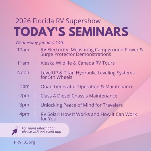 The 2026 Florida RV SuperShow opened today in Florida, offering a full slate of seminars aimed at RV owners, campground operators, and industry professionals. The event’s educational sessions cover topics from campground electrical safety to RV solar systems, highlighting practical operational knowledge for the outdoor hospitality sector.