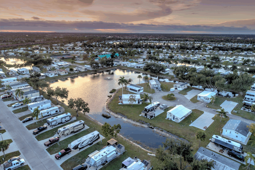 Sun Resorts and Residences Sanibel Gateway in Fort Myers, a 55-and-over resort with 797 sites, offers two swimming pools, pickleball and bocce courts, a fitness center, dog park, and fishing ponds.