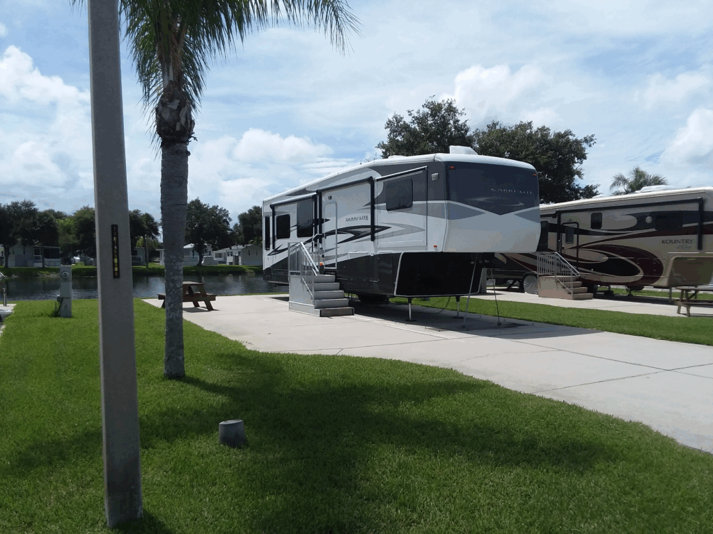 Pine Glen Motorcoach & RV Park in Panama City Beach, Florida, provides waterfront campsites and stocked fishing ponds. The park’s three-month snowbird special is $3,850.