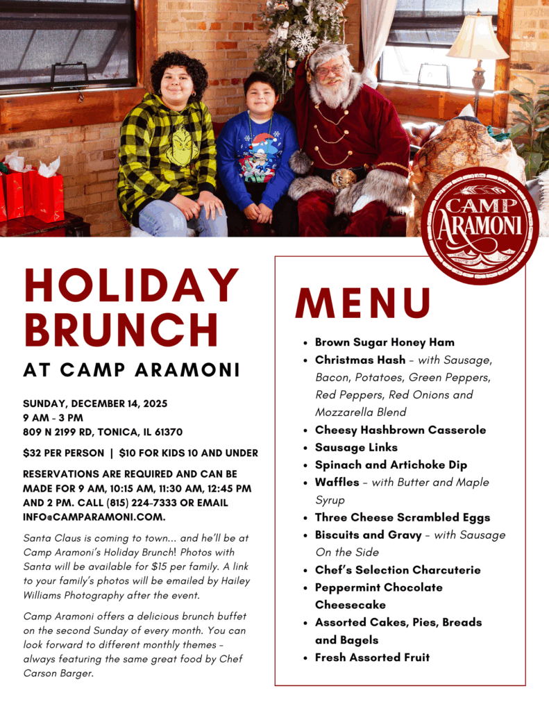 Reservations for the Holiday Brunch and other experiences at Camp Aramoni can be made by calling (815) 224-7333 or emailing [email protected].