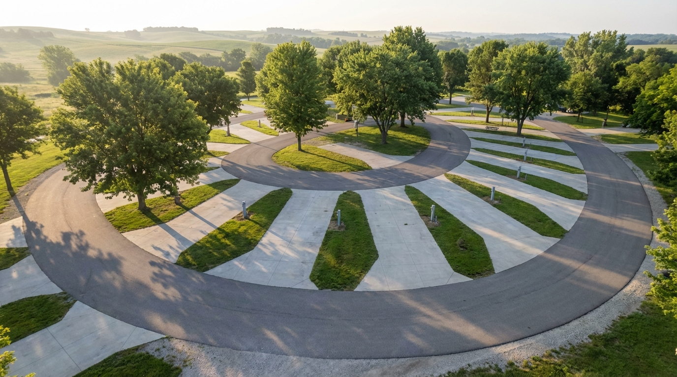 Circular layouts have become an industry-preferred design because they naturally reduce vehicle speeds as drivers navigate curves rather than straight thoroughfares, enhancing pedestrian safety throughout the facility. This configuration creates a sense of community among campers within each loop while maintaining separation between different groups.