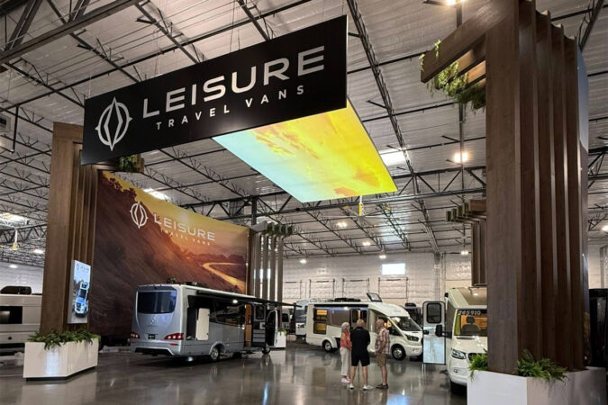 “Desert Shadow blends warm, earthy neutrals with a refined, cool counterpoint. You see it in the Mist Corian countertop and flooring, balanced by White Oak cabinetry, Dune Ultrafabrics, and soft-beige uppers. Black fixtures, hardware, and custom exterior badging tie it all together,” Cori Derksen, interior designer at Leisure Travel Vans, said in a press release.