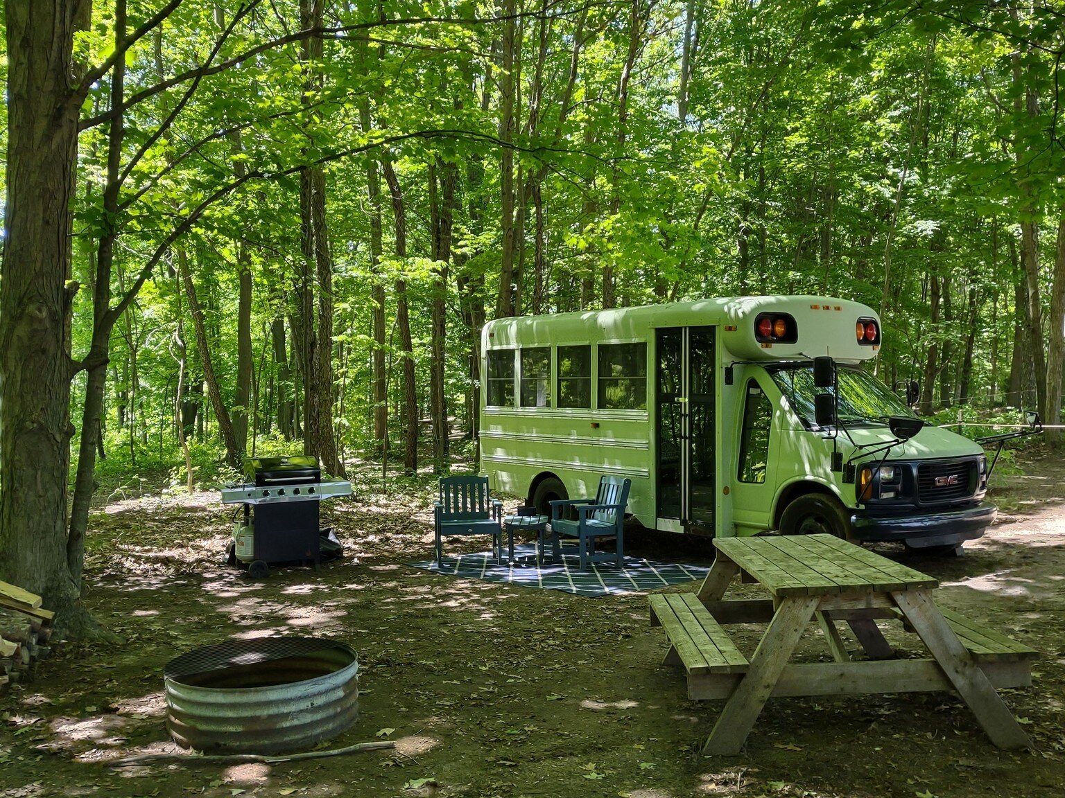 Guests can choose from vacation homes, cozy camping cabins, full hook-up RV spaces, and unique options like a converted Skoolie bus and rental RVs. For those seeking a more rustic stay, the campground features wooded glamping tents and primitive camping sites.