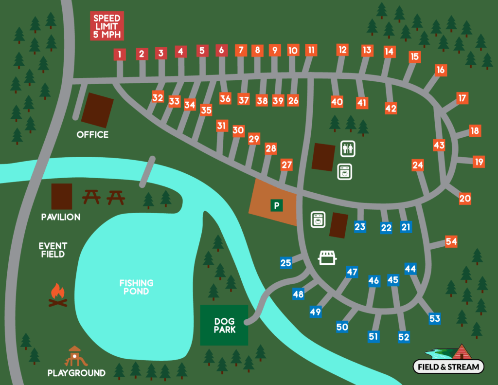 Field & Stream RV Park provides 54 full-sized, full-hookup sites for RVs, alongside clean and modern restroom and shower facilities. The campground emphasizes safety, cleanliness, and comfort for its visitors.