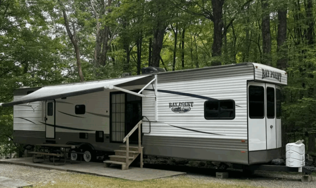 Guests can enjoy a range of on-site amenities designed for comfort and convenience. Among its key features are a solar-heated Olympic swimming pool, hot tub, camp store, and multi-use clubhouse.