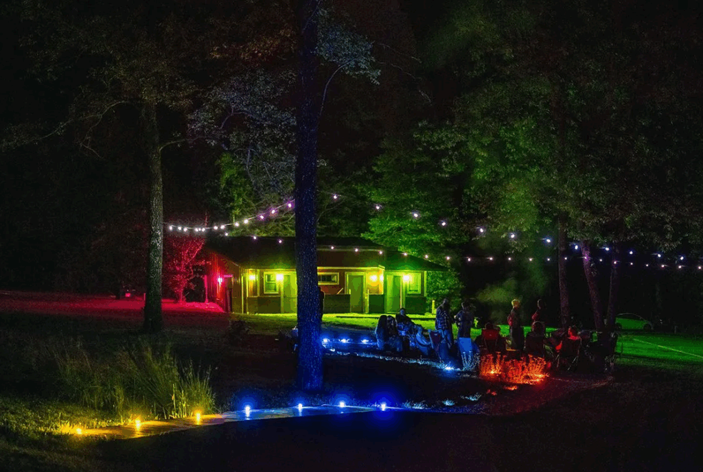 The resort features a variety of lodging options, including themed glamping pods, forest villas, van and RV pads, and primitive campsites. Amenities include a spring-fed swimming pond, cold plunge, sauna, community kitchen, fire circle, event space and private family-style bathrooms.