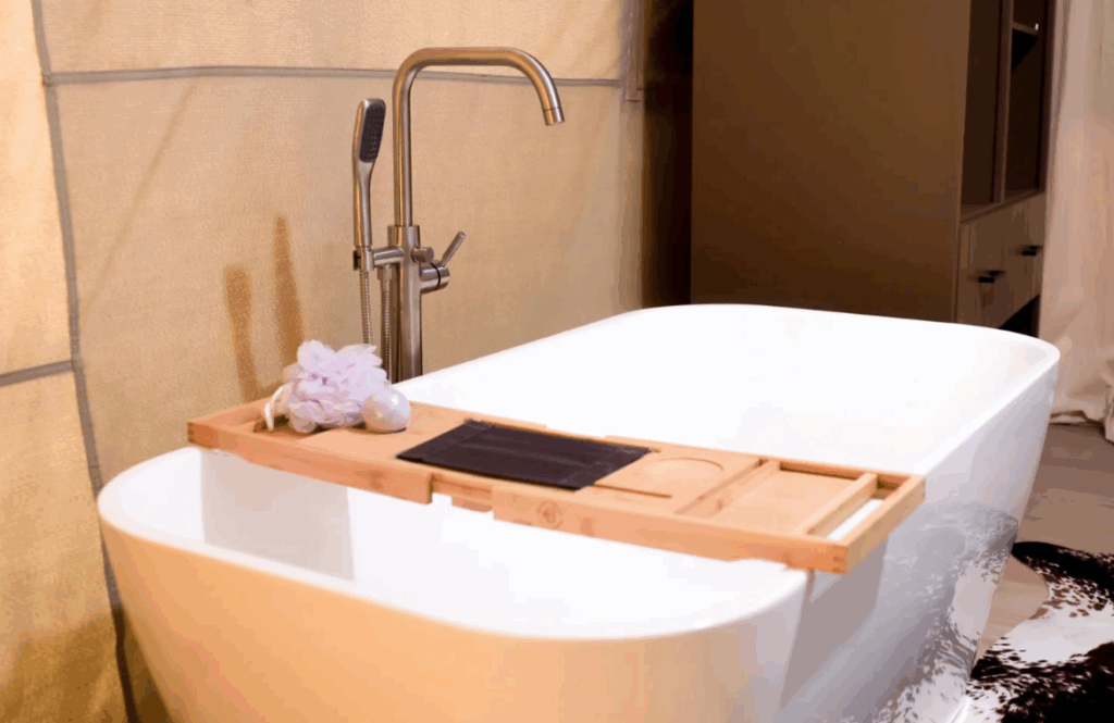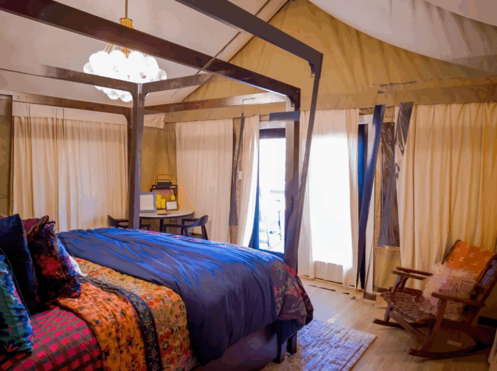 The McClenton Hideout offers guests a climate-controlled safari-style tent featuring a king-sized bed, a soaker tub, a refrigerator, and a coffee machine. The tent’s deck is furnished with rocking chairs to provide a comfortable outdoor seating area.