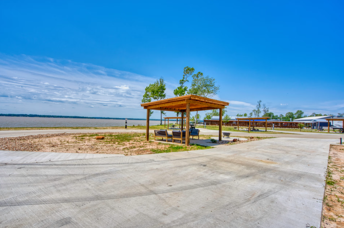 The property, situated on Lake Livingston, features 204 full-hookup sites capable of accommodating large rigs. Amenities on the 54-acre grounds include a 180,000-gallon lagoon pool, a swim-up bar, and a dance pavilion.